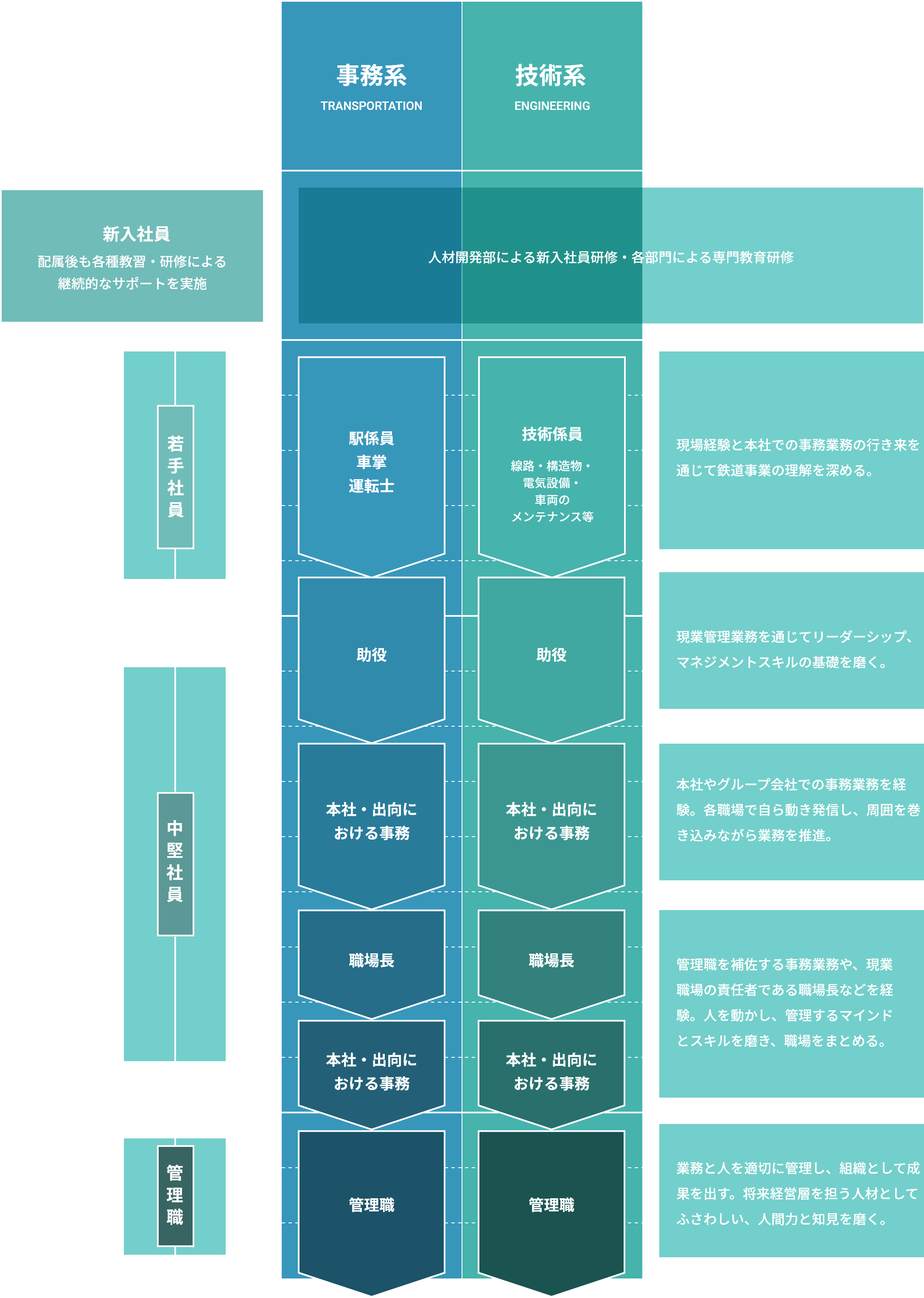 新しい生活様式の浸透、少子高齢化等による収益源の減少が深刻化する中、どのような環境下でも発展し続ける、強い鉄道会社を作り上げるため、将来の鉄道会社の経営を担える人材や、鉄道事業において経験・人脈・知識を蓄え、専門性を持つ人材の育成を行っています。